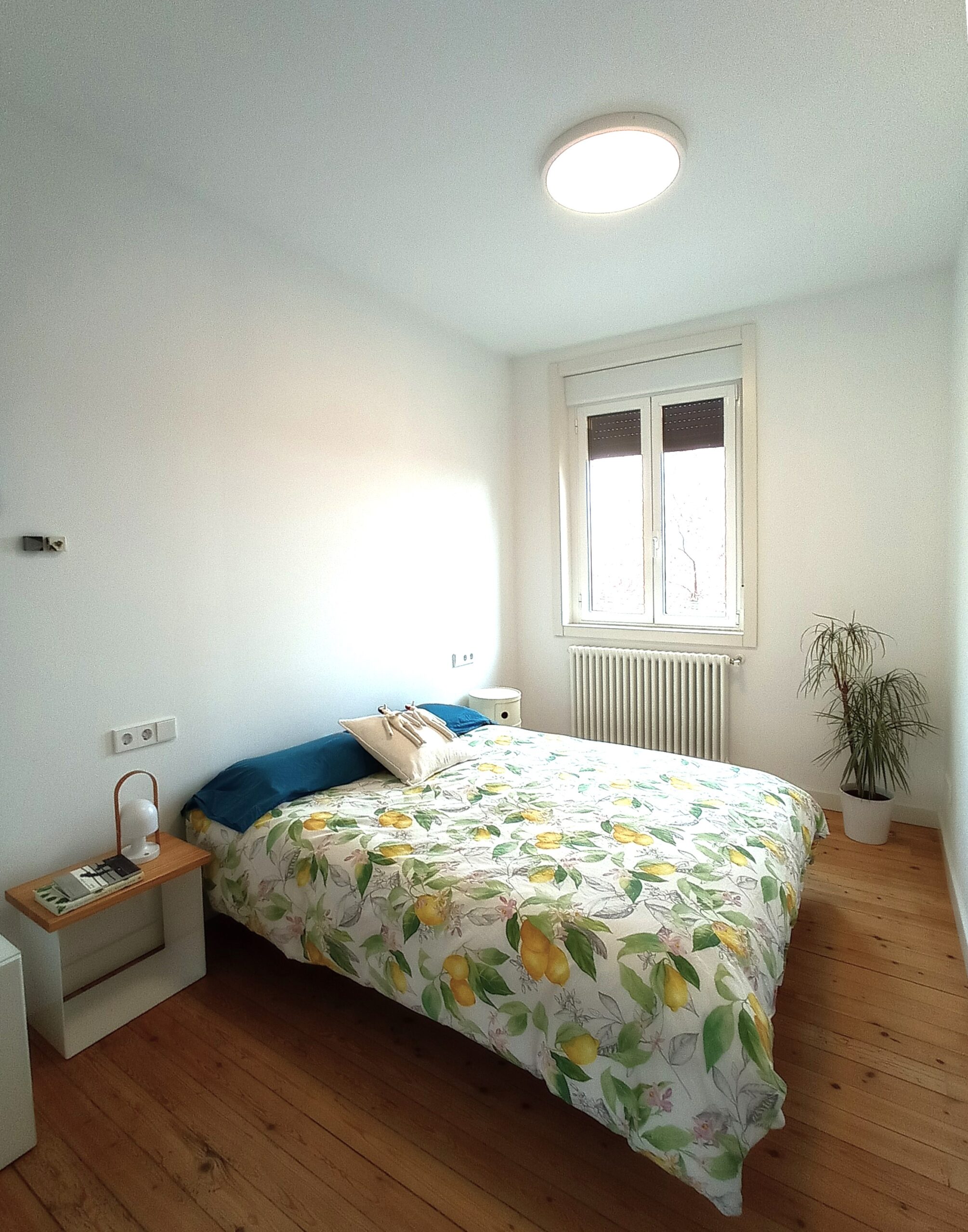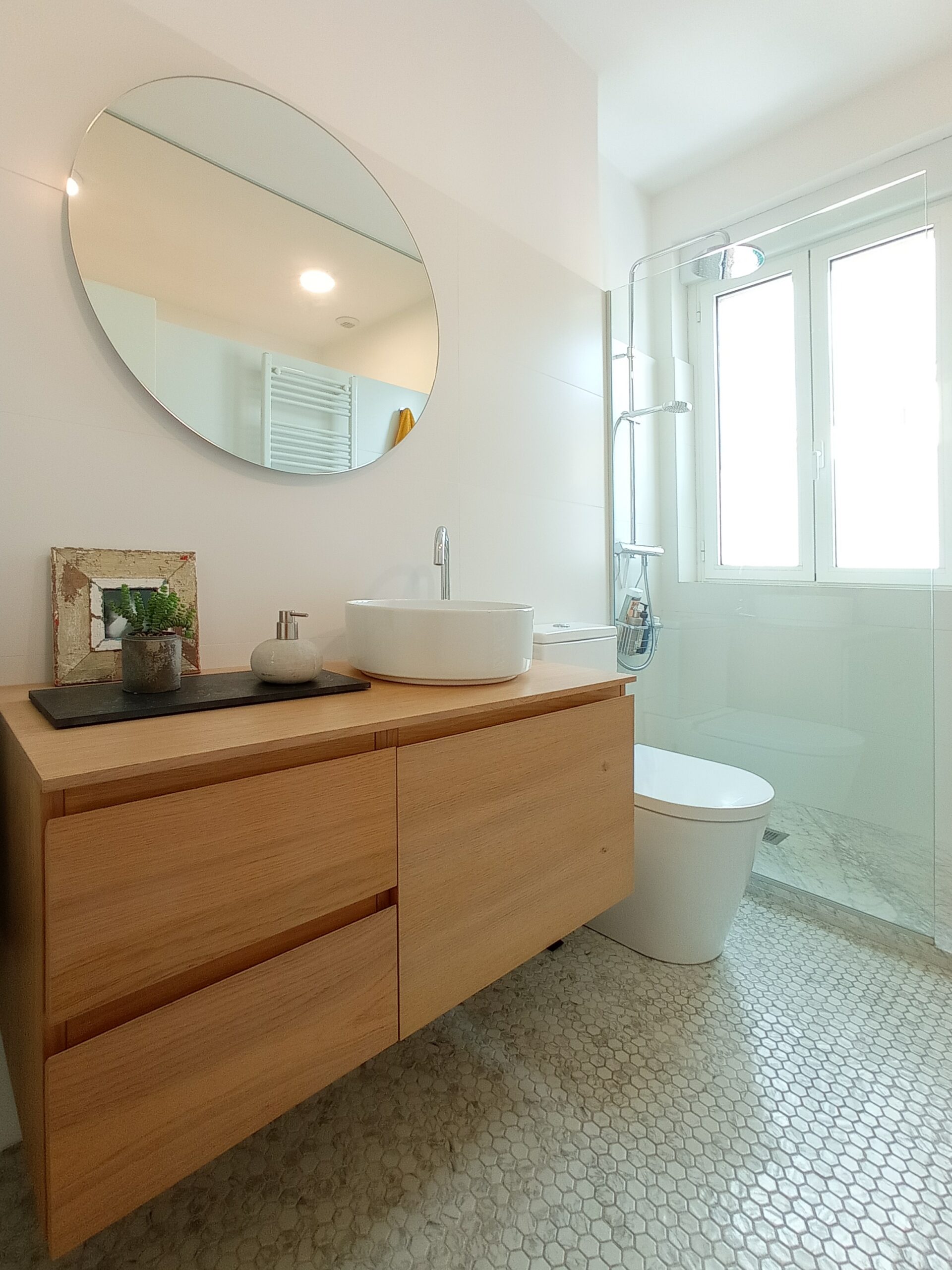 La obra fue muy sencilla porque básicamente la única distribución fue la del baño, el resto de divisiones se llevó a cabo con el propio mobiliario. Se mantuvieron los suelos originales, de pino en habitaciones y de gres de cocina y baño, aplicando sobre ellos pintura específica para suelos. El resto de obra fue la habitual de una reforma integral: aislamiento de paredes de fachadas y techo, cambio de ventanas, nuevas instalaciones, etc. Acabada la obra llevamos a cabo el equipamiento de toda la vivienda y entregamos la llave al cliente.