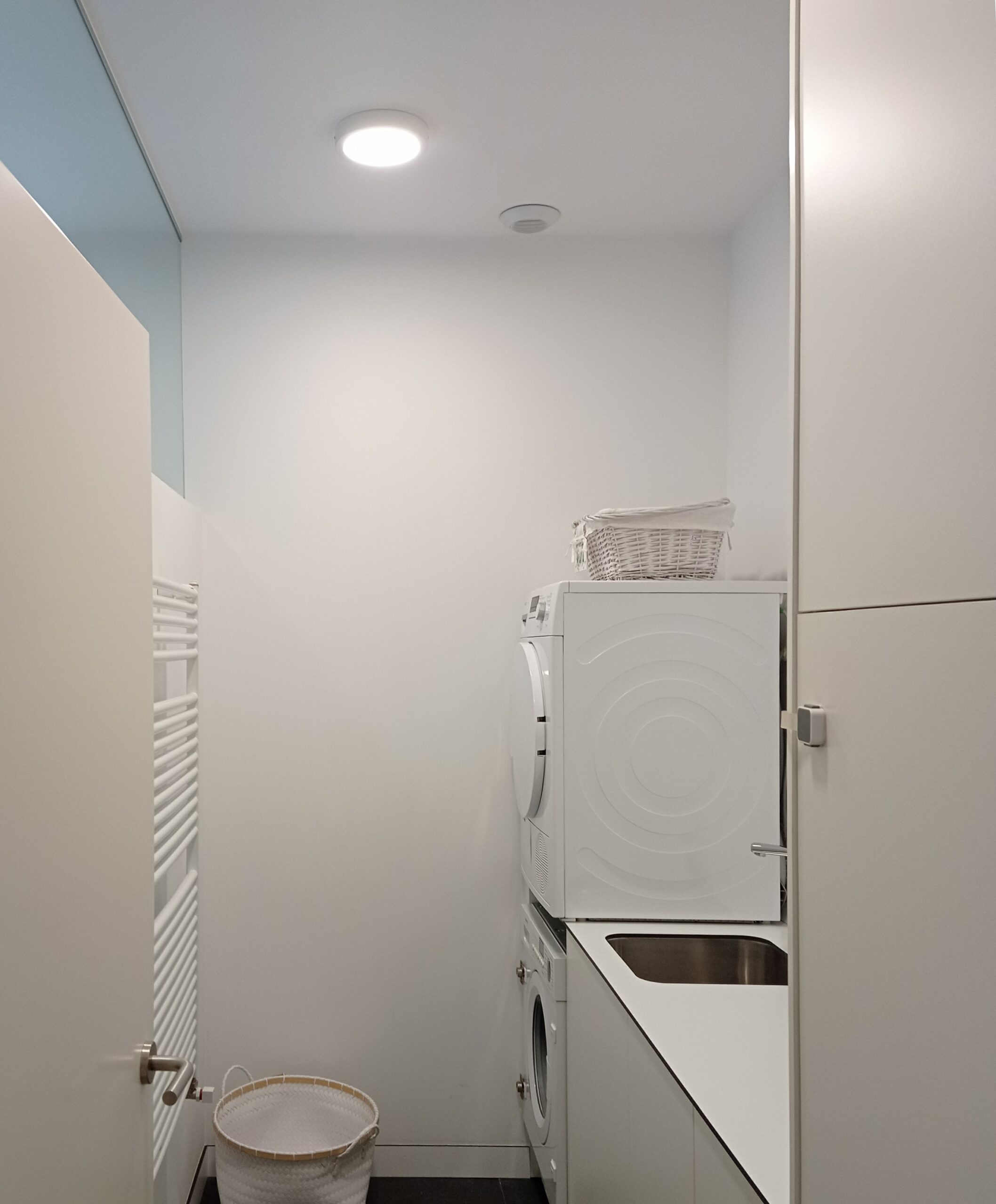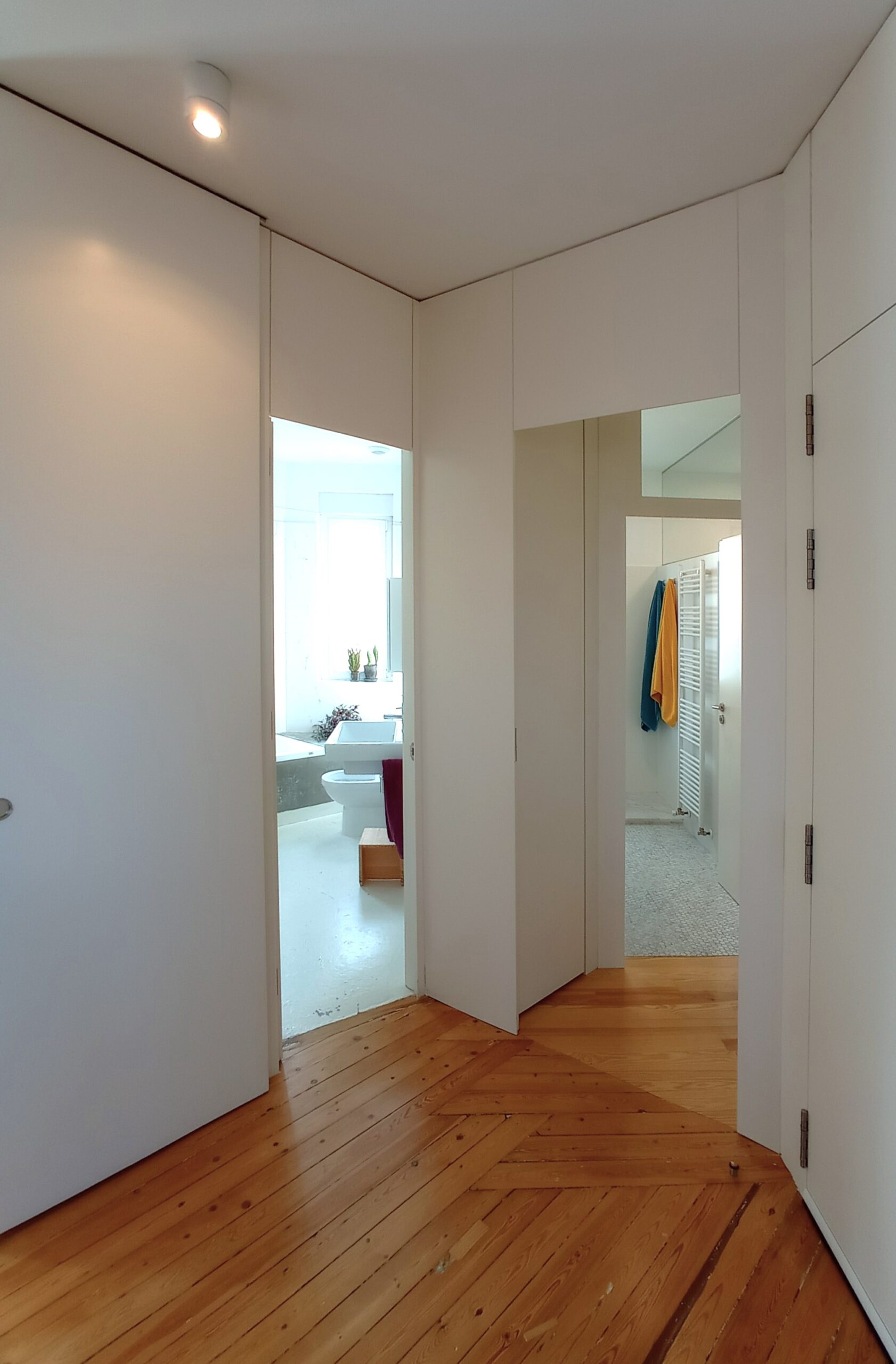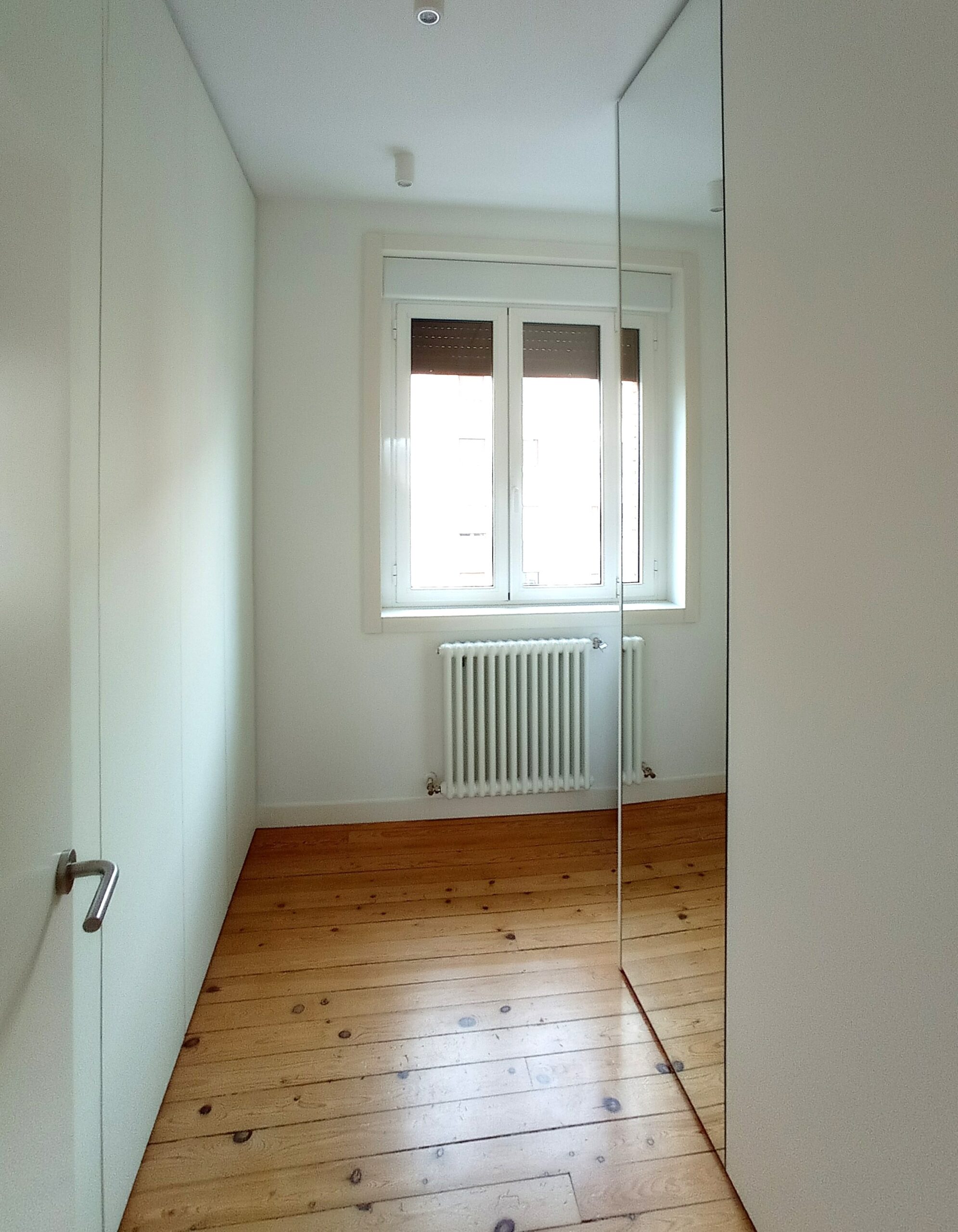 La propuesta para la ampliación de la vivienda cumplía con todo lo necesario: zona de día con estar, cocina-comedor y baño, y zona de noche con tres dormitorios, el principal con vestidor, un baño común y un cuarto de lavado. La obra a realizar en la parte que ya habíamos reformado era mínima, tan sólo con eliminar el armario del dormitorio teníamos el espacio perfecto para la cocina-comedor que buscábamos. En la zona de ampliación se siguieron los mismos criterios estéticos que en el proyecto inicial, un fondo blanco en paredes y techos para resaltar el suelo original de tarima de pino, algunas puertas y tabiques con un fijo superior acristalado para permitir el paso de luz entre algunas estancias y hacia el nuevo pasillo dando a la vez una continuidad espacial, y en el nuevo baño y lavadero unos revestimientos que reflejasen un ambiente limpio y luminoso.