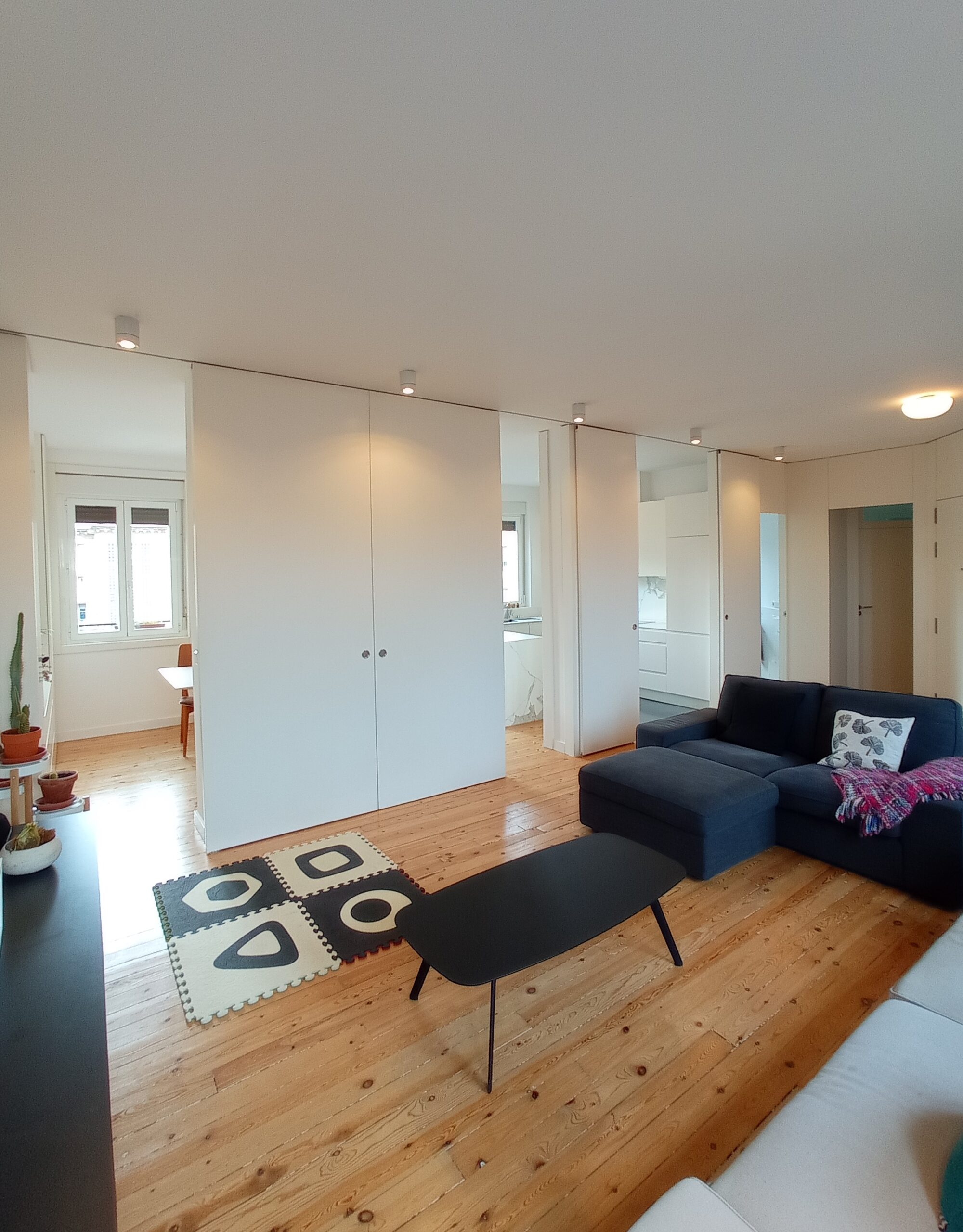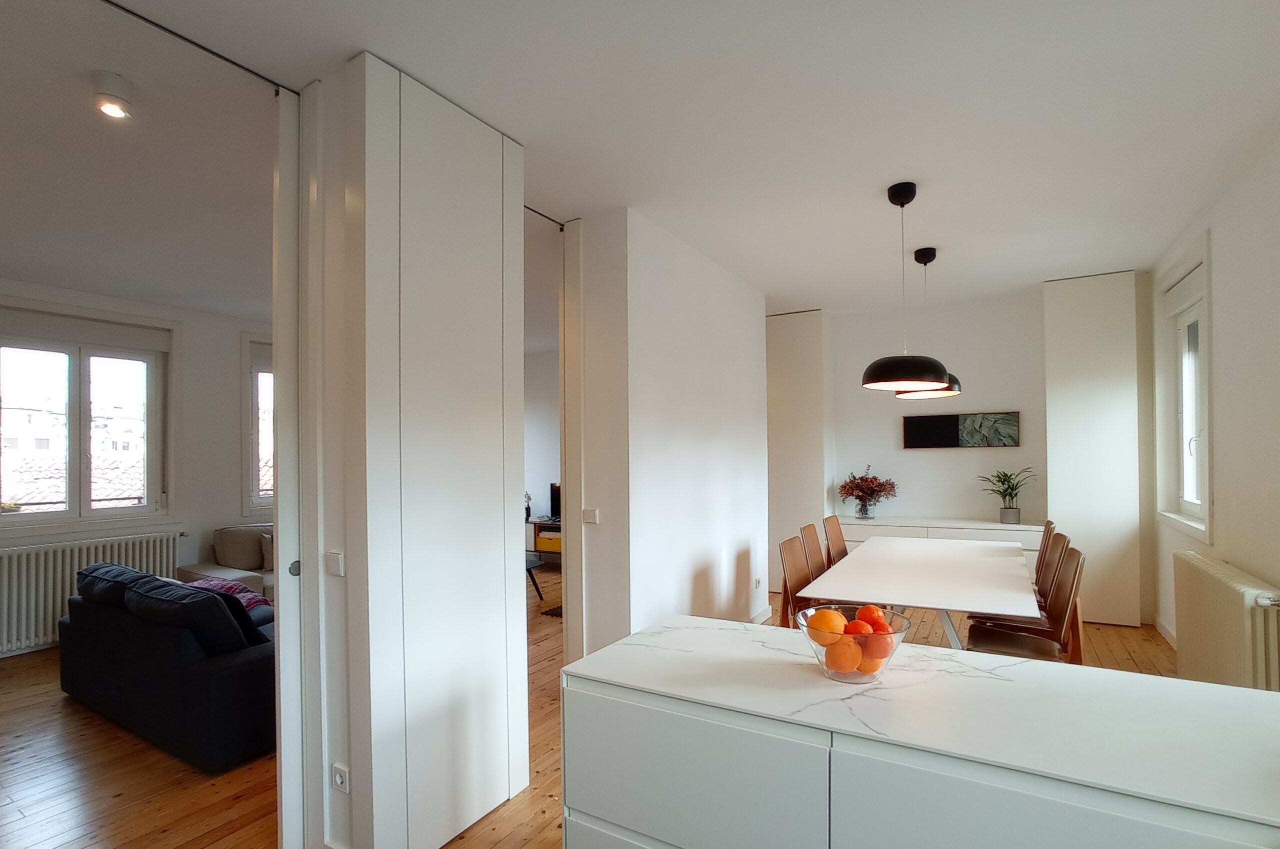 Encontrada la vivienda que tenía todo lo necesario para conseguir el objetivo deseado, le explicamos al cliente el potencial que tenía y realizamos los primeros croquis de distribución. La idea principal era potenciar la doble orientación con la que contábamos, de manera que se pudiese ver toda la dimensión del espacio total de la vivienda y se prolongase con las visuales al exterior libres de edificios cercanos. Un estar-comedor en el espacio orientado al noroeste, y cocina, dormitorio y baño en el espacio con orientación sureste. Entre ambos unos paneles correderos de suelo a techo a modo de paredes móviles dividirían las estancias cuando fuese necesario y el propio mobiliario serviría para delimitar los espacios. Dicho y hecho, nos pusimos manos a la obra.